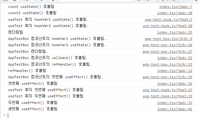 1. 부모 컴포넌트의 useState 가 호출됩니다. 2. 부모 컴포넌트에 명시된 커스텀 훅의 useState 가 호출됩니다. 3. 부모 컴포넌트의 뷰(View)가 렌더링 됩니다. 4. 자식 컴포넌트인 AppTestBox 의 useState 가 호출됩니다. 5. 자식 컴포넌트인 AppTestBox 의 뷰(View)가 렌더링 됩니다. 6. 자식 컴포넌트인 AppTestBox 에서 요소의 ref 속성에 넘겼던 콜백함수가 호출됩니다. 7. 부모 컴포넌트에서 요소의 ref 속성에 넘겼던 콜백함수가 호출됩니다. 8. 자식 컴포넌트인 AppTestBox 의 useEffect 함수들이 호출됩니다. 9. 부모 컴포넌트에 명시된 useEffect 함수들이 호출됩니다. 9-1. 작성한 순서에 따라 useEffect 함수는 순차적으로 호출됩니다. 9-2. 부모컴포넌트에 작성된 useEffect 함수들 중간에 커스텀 훅이 존재하고 커스텀 훅 안에 useEffect 가 존재하면 커스텀 훅 안의 useEffect 가 호출되고, 그 다음에 명시된 부모컴포넌트의 useEffect 가 호출됩니다.