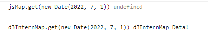 const jsMap = new Map(); jsMap.set(new Date(2022, 7, 1), 'jsMap Data!'); console.log(`jsMap.get(new Date(2022, 7, 1))`, jsMap.get(new Date(2022, 7, 1))); console.log(`==============================`); const d3InternMap = new d3.InternMap(); d3InternMap.set(new Date(2022, 7, 1), 'd3InternMap Data!'); console.log(`d3InternMap.get(new Date(2022, 7, 1))`, d3InternMap.get(new Date(2022, 7, 1)));결과는 다음과 같습니다.