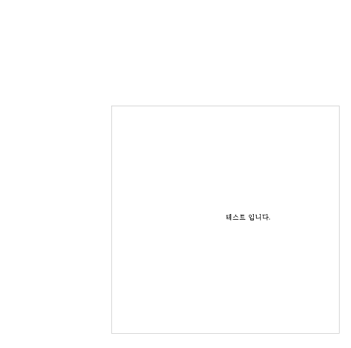 import * as d3 from 'd3'; // https://github.com/d3/d3-zoom#ZoomTransform_ window.addEventListener('load', function() { const w = 400; const h = 400; const canvas = document.createElement('canvas'); const context = canvas.getContext('2d'); canvas.width = w; canvas.height = h; const transform = new d3.ZoomTransform(0.8, 100, 100); // k, x, y console.log('transform', transform); console.log('transform.toString()', transform.toString()); const boxElement = document.querySelector<HTMLElement>('.box'); if (boxElement !== null) { boxElement.style.transform = "translate(" + transform.x + "px," + transform.y + "px) scale(" + transform.k + ")"; } if (context !== null) { context.font = '12px serif'; context.fillText('테스트 입니다.', 200, 200); context.fillStyle = '#000'; } document.querySelector<HTMLElement>('.box')?.appendChild(canvas); });결과는 다음과 같습니다.