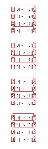 저 상태에서 시계방향으로 90도 회전한다고 했을 때 [0][0] 부터 [3][3] 까지 이동 되는 경로는 아래와 같습니다.
