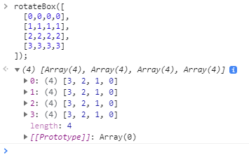 function rotateBox(box) { var box_max_index = box.length - 1; var new_box = []; for (var i = 0; i < box.length; i++) { var row = []; for (var k = 0; k < box.length; k++) { row.push(0); } new_box.push(row); } for (var i = 0; i < box.length; i++) { for (var k = 0; k < box[i].length; k++) { var after_row = k; var after_col = box_max_index - i; new_box[after_row][after_col] = box[i][k]; } } return new_box; }다음과 같이 테스트를 진행해보았습니다.
