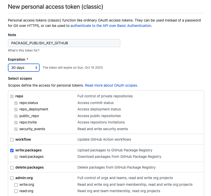 2) 토큰 이름은 "PACKAGE_PUBLISH_KEY_GITHUB" 으로 지정하고 scope 는 "write:packages" 를 선택 후 "Generate token" 클릭