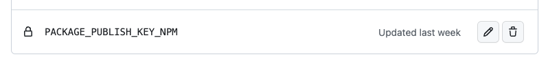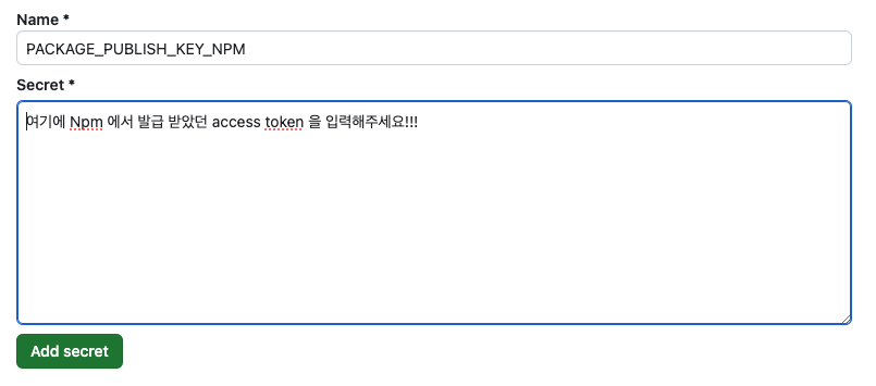 4) key 이름은 "PACKAGE_PUBLISH_KEY_NPM" 으로 지정하며, 토큰은 앞서 npm 에서 발급받은 access token 입력 후 Add secret 클릭