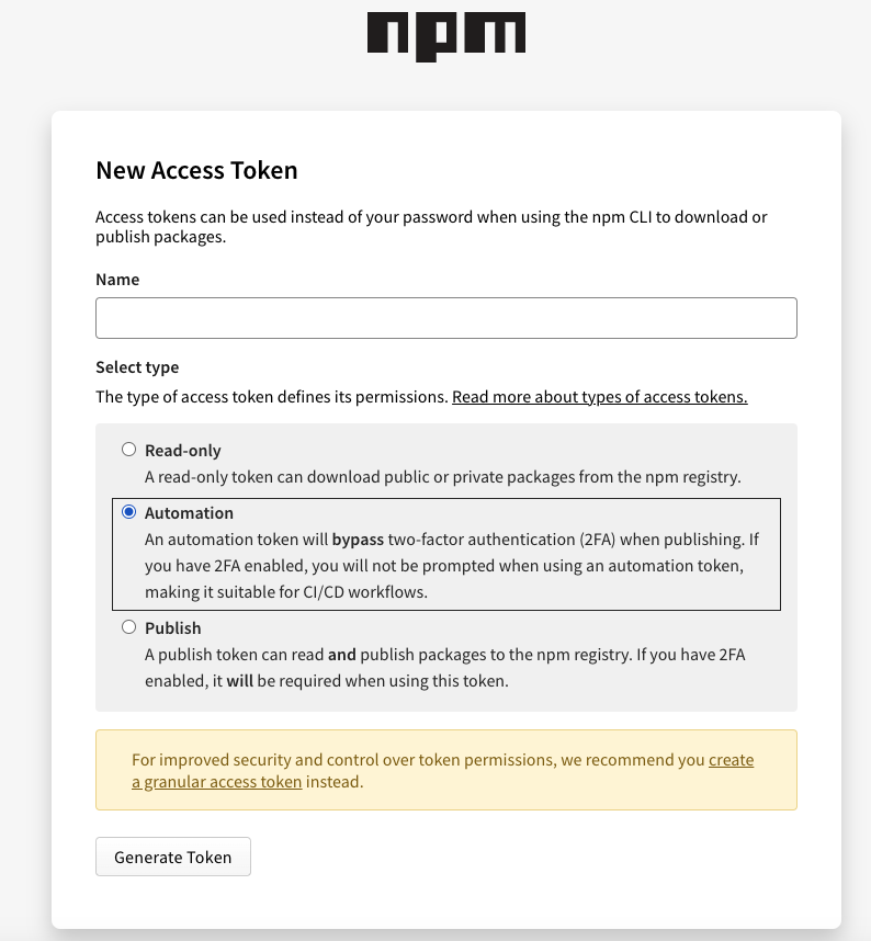 4) 토큰 Name 입력, Automation 선택 후 "Generate Token" 버튼 클릭