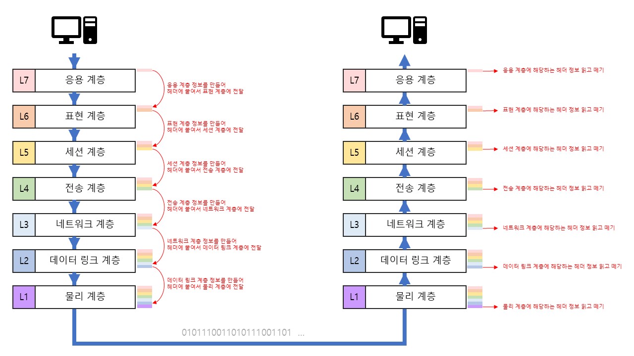 출발지에서 데이터가 나갈 때는 7계층 부터 1계층 까지 거치게 되고, 이 때 각 계층을 거칠 때마다 해당 계층에 해당 하는 정보를 하위 계층에 전달해줍니다. 목적지로 데이터가 들어갈 때는 1계층 부터 7계층 까지 거치게 되고, 이 때 해당 계층에 해당하는 정보를 읽고 제거한 다음 상위 계층으로 전달해줍니다. 그림으로 표현하면 다음과 같이 표현 할 수 있을 것 같습니다.