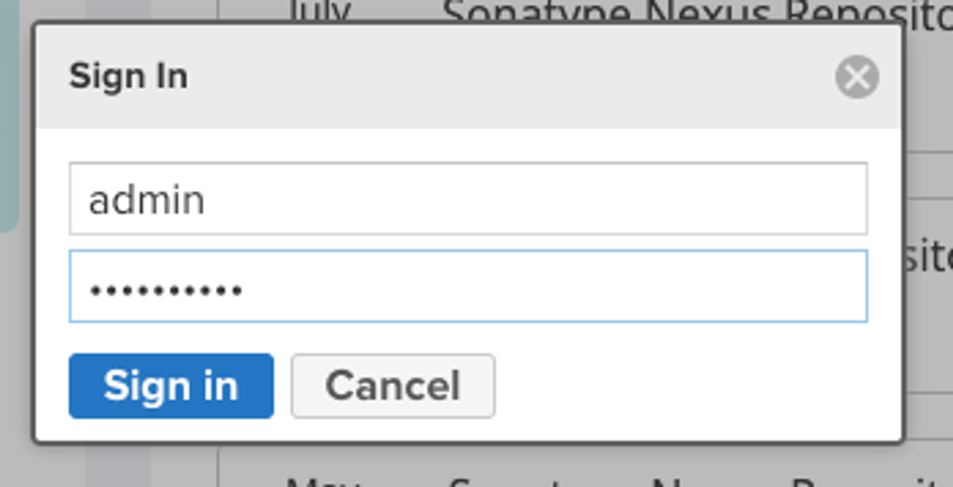 cat /nexus-data/admin.password4) 다시 Nexus Sign in 페이지로 돌아와서 아래와 같이 ID, PASSWORD 를 입력하여 로그인 합니다.