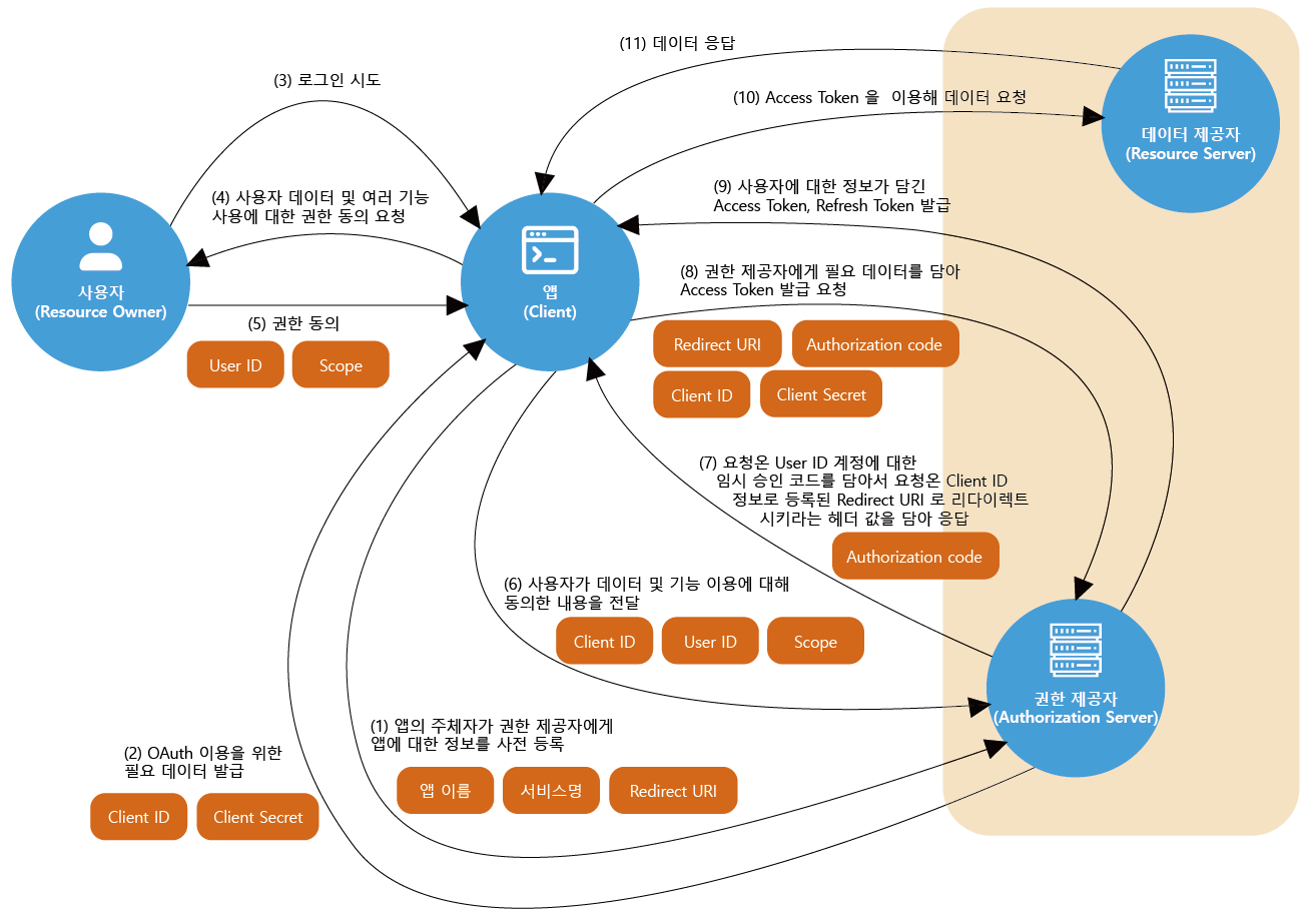 앱(Client)은 권한 제공자(Authorization Server) 에게 받은 Access Token 을 이용해 데이터 제공자 (Resource Server) 에게 데이터 요청을 합니다. 데이터 제공자는 요청 값에 담긴 Access Token 을 확인하여, 데이터를 제공하거나 제공하지 않을 수 있습니다. Access Token 은 보통 유효 기간이 짧게 발행되는데, 만료되었을 경우에는 Refresh Token 으로 권한 제공자에게 간단하게 신규 Access Token 을 재발급 받을 수 있습니다.